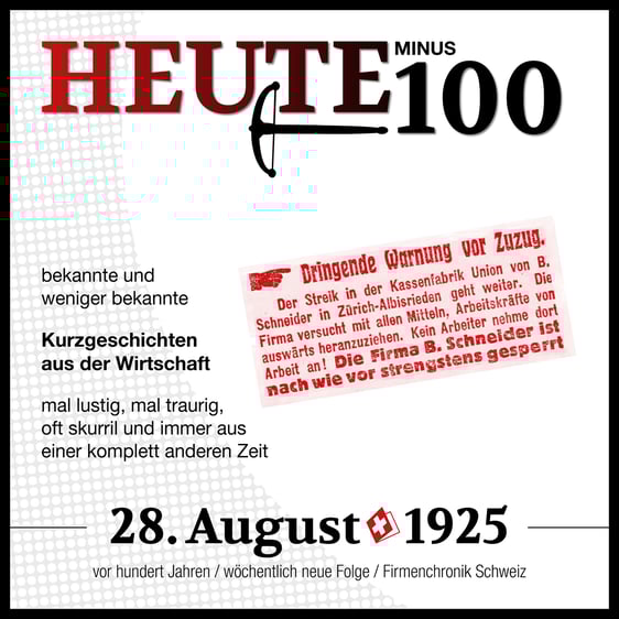 🗞 Die Gewerkschaften erlangten eine gewisse Macht. So der Schweizerische Metall- und Uhrenarbeiterverband SMUV. Dieser brachte während fast hundert Jahren (1902 bis 2001) eine eigene Zeitung heraus. Grosses Thema im Sommer/Herbst 1925 war der Streik in der Kassenfabrik Union, B. Schneider, einer Spezialfabrik für feuer- und einbruchsichere Kassen-Schränke in Zürich-Albisrieden mit Geschäft an der Gessnerallee 36. Die Union-Kassenfabrik wurde in den 1970er-Jahren von der Bauer Holding AG übernommen (heute Dormakaba Holding AG).